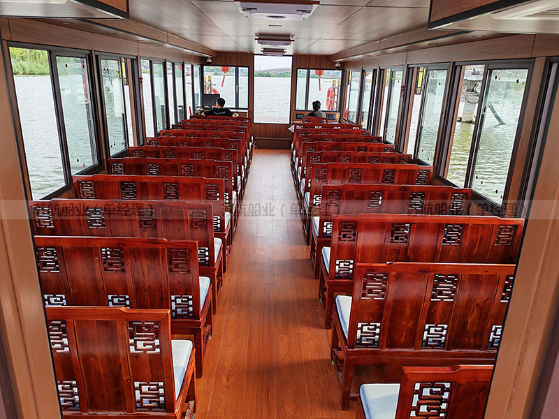 标准配置 | 木质船底外包13层高分子防护层、船顶外包防护层、上装欧雅木雕实木门窗或铝合金门窗(二选一)、船舶专用地板、前后系船绳4根、救生衣59件、救生圈2个、304不锈钢系船环6个、照明灯具1套 |