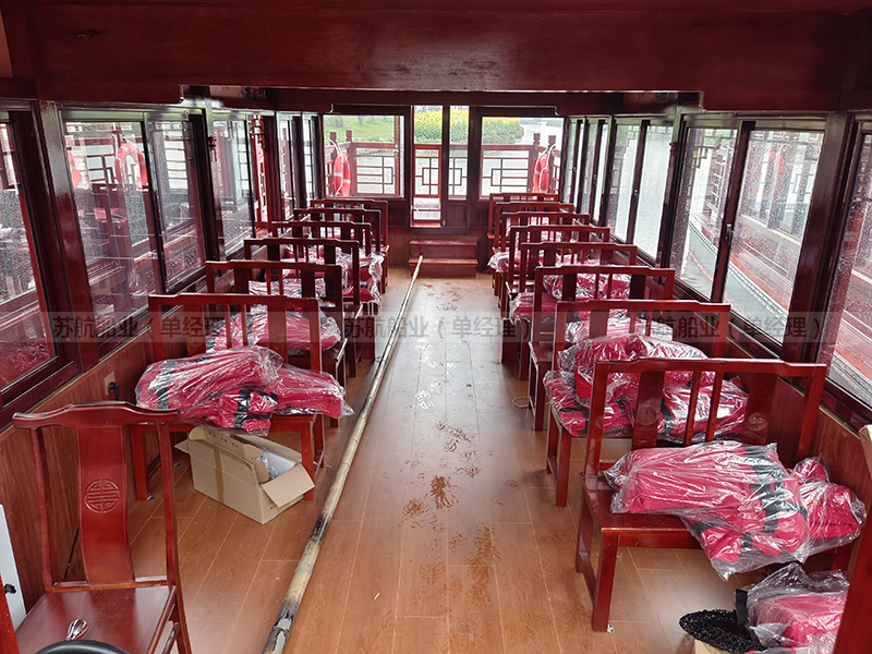 标准配置 | 木质船底外包10层高分子防护层、船顶外包防护层、上装欧雅木雕实木门窗或铝合金门窗(二选一)、船舶专用地板、前后系船绳4根、救生衣32件、救生圈4个、系船桩4个、照明灯具1套 |