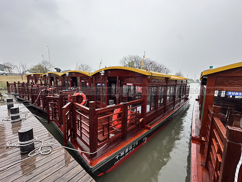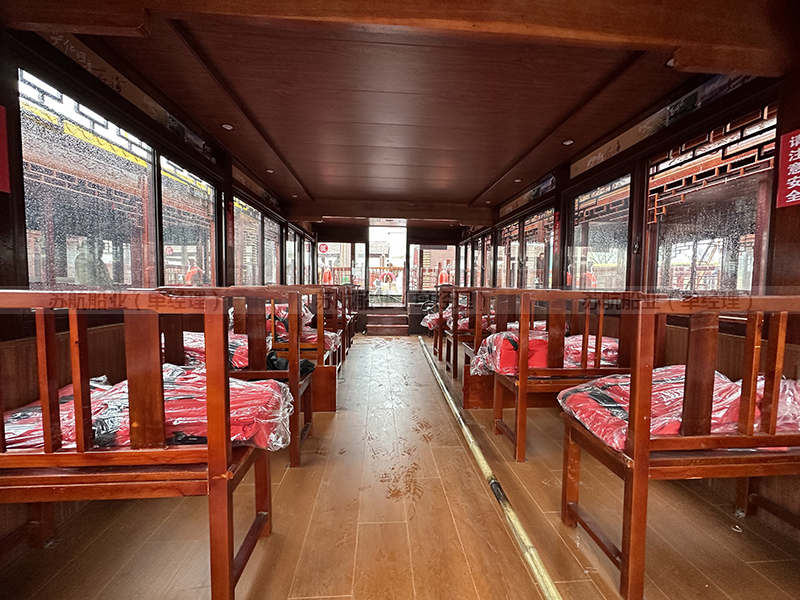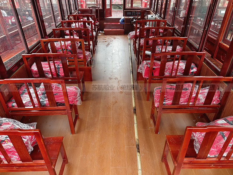 标准配置 | 木质船底外包10层高分子防护层、船顶外包防护层、上装欧雅木雕实木门窗或铝合金门窗(二选一)、船舶专用地板、前后系船绳4根、救生衣32件、救生圈4个、系船桩4个、照明灯具1套 |